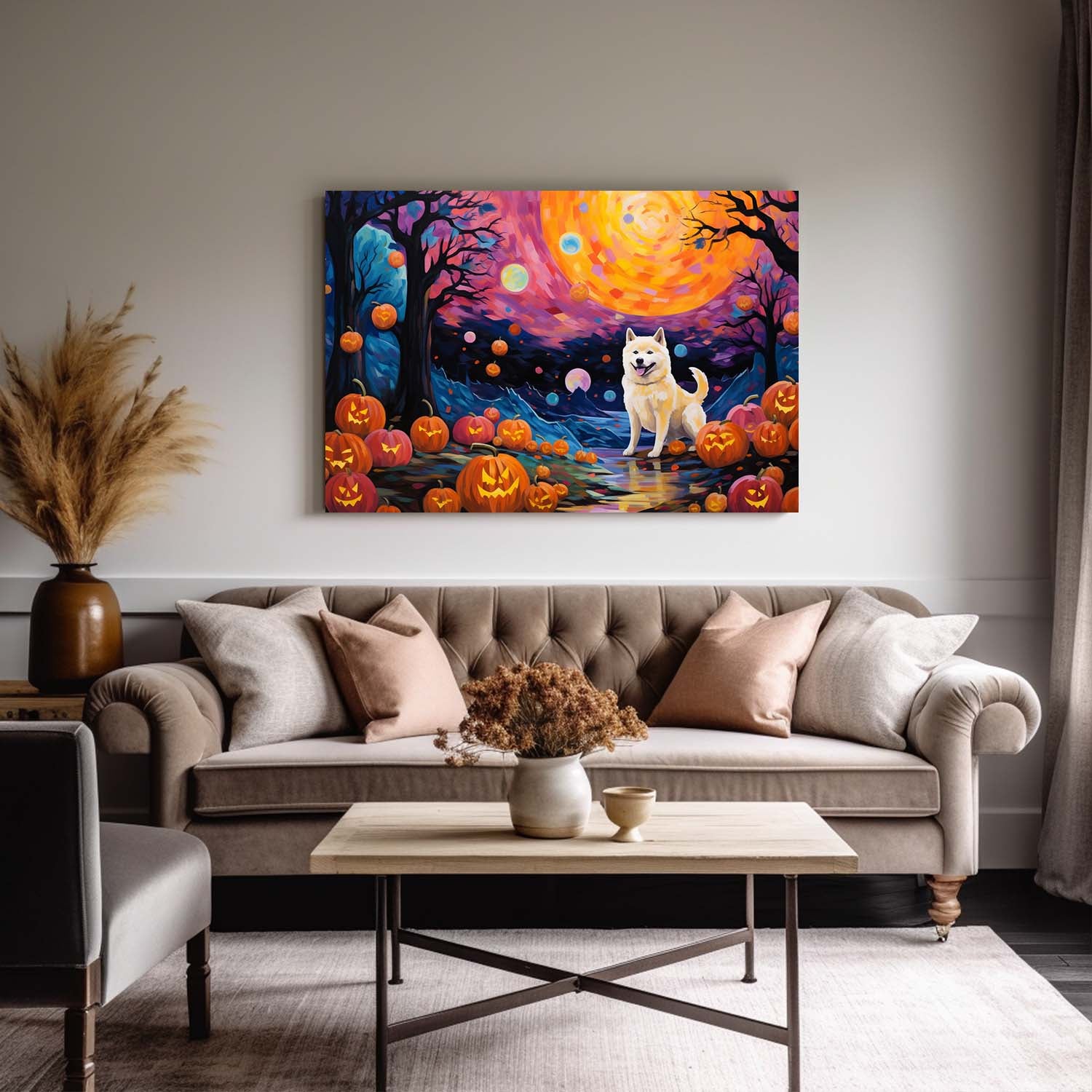 Akita Dog 01 Halloween With Pumpkin Oil Painting Van Goh Style, Wooden Canvas Prints Wall Art Painting , Canvas 3d Art