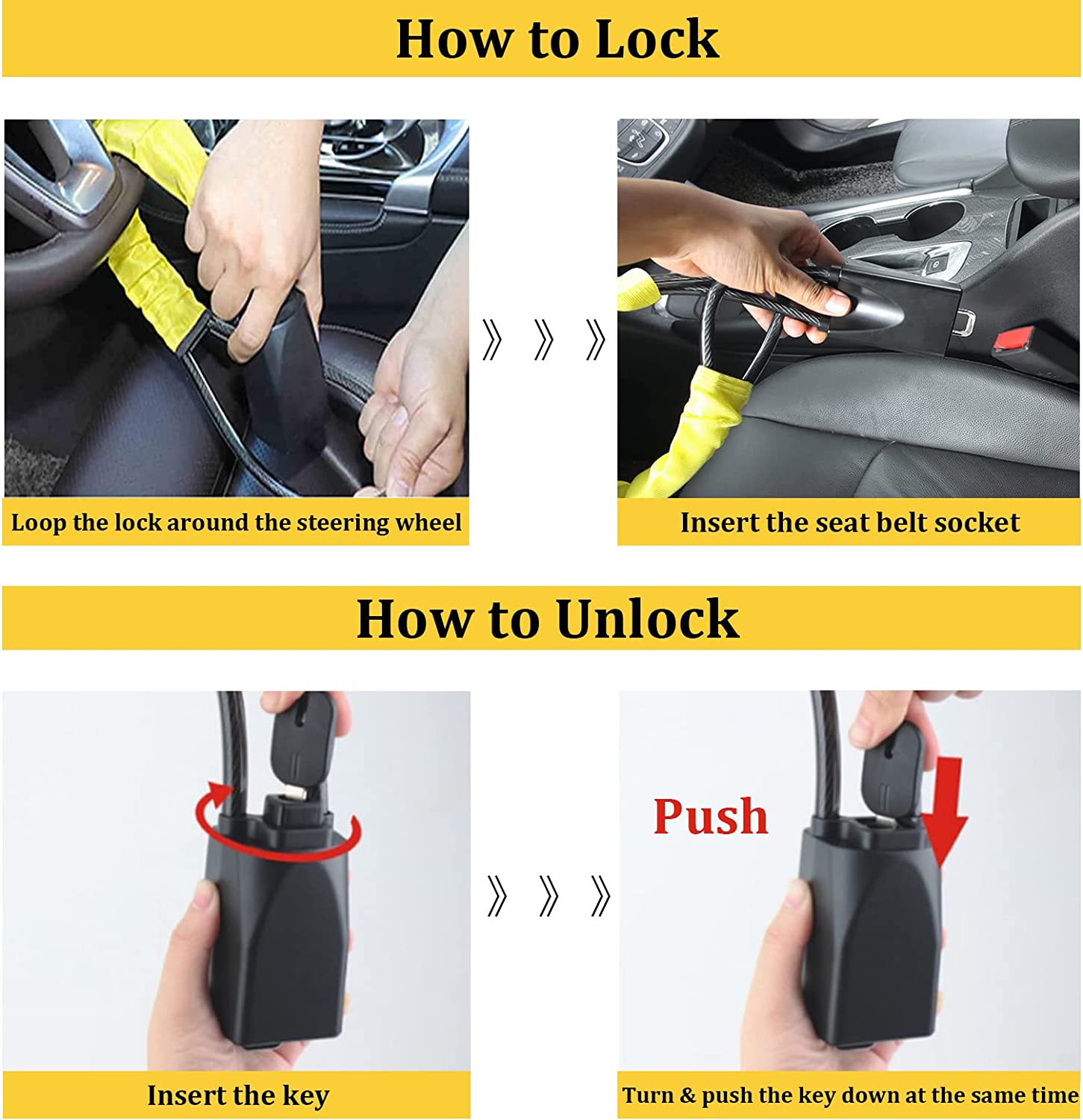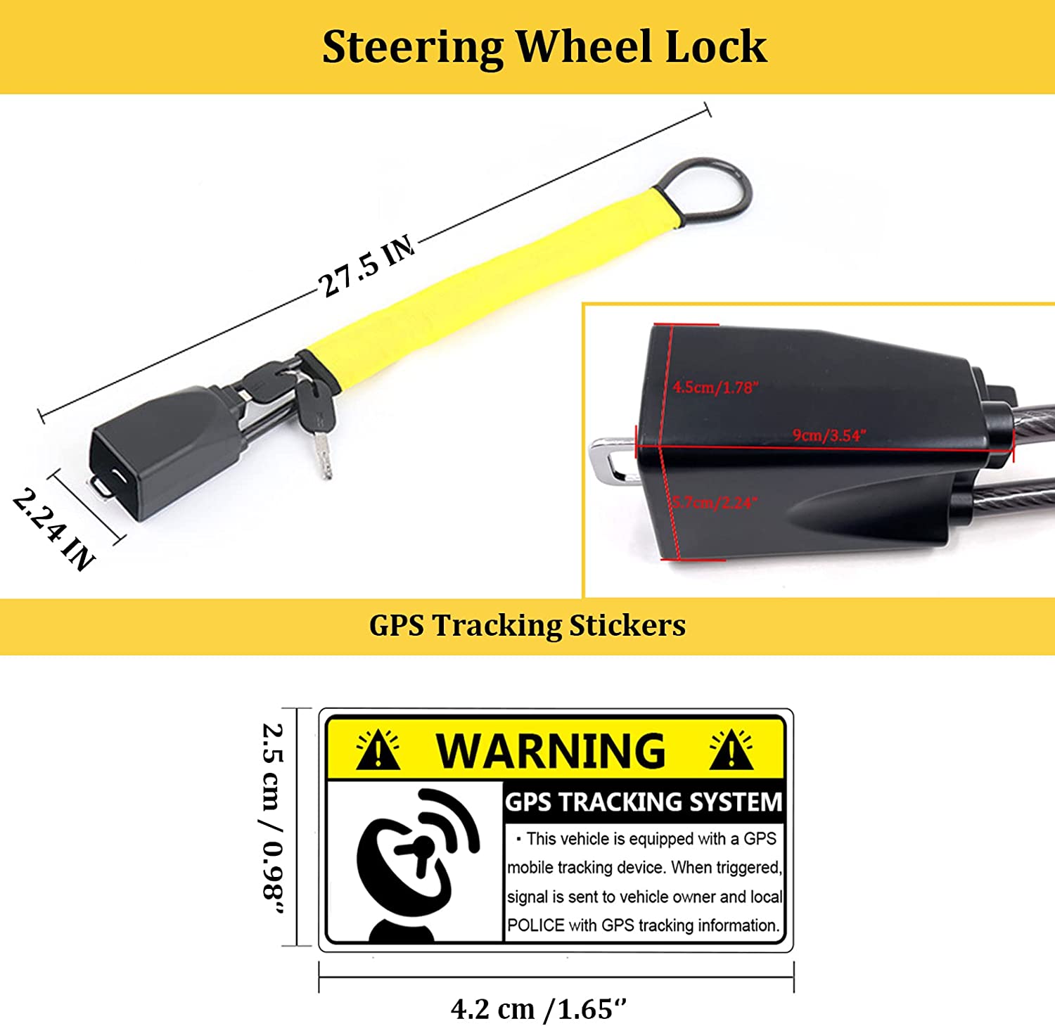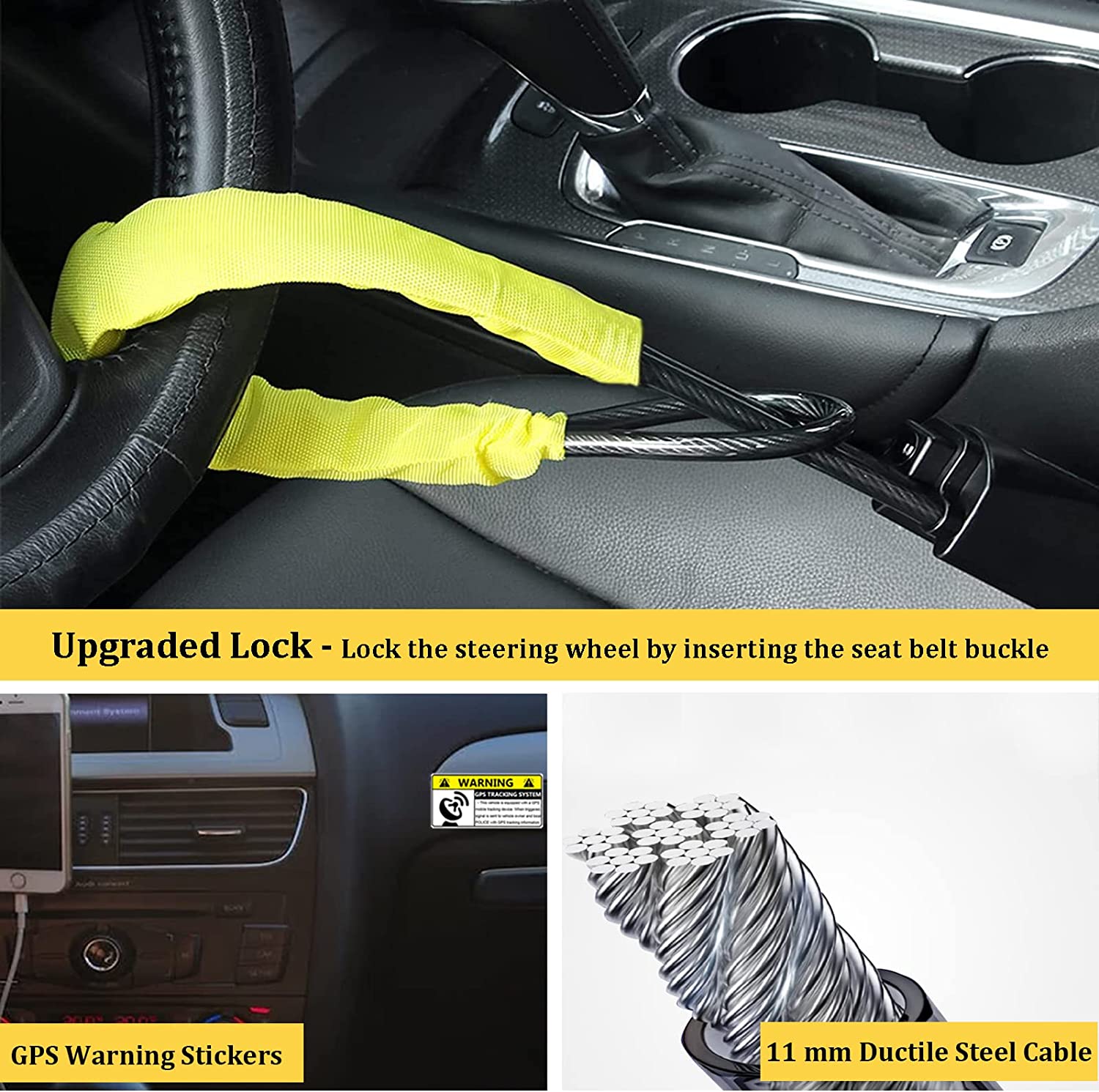 Car Steering Wheel Lock Seat Belt Lock with 4pcs GPS Tracking Sticker, Sturdy Car Security Anti Theft Car Device, Steering Wheel Lock Anti-Theft Device + 2 Keys Universal Fit Truck/SUV/Van