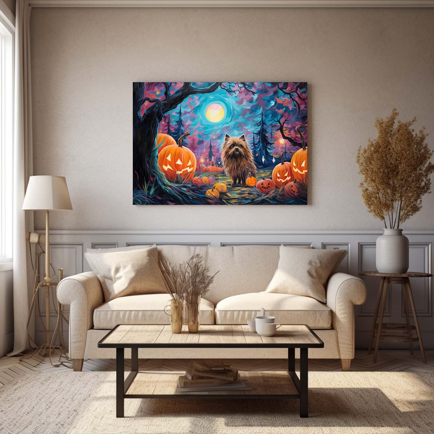 Keeshonden Dog 02 Halloween With Pumpkin Oil Painting Van Goh Style, Wooden Canvas Prints Wall Art Painting , Canvas 3d Art