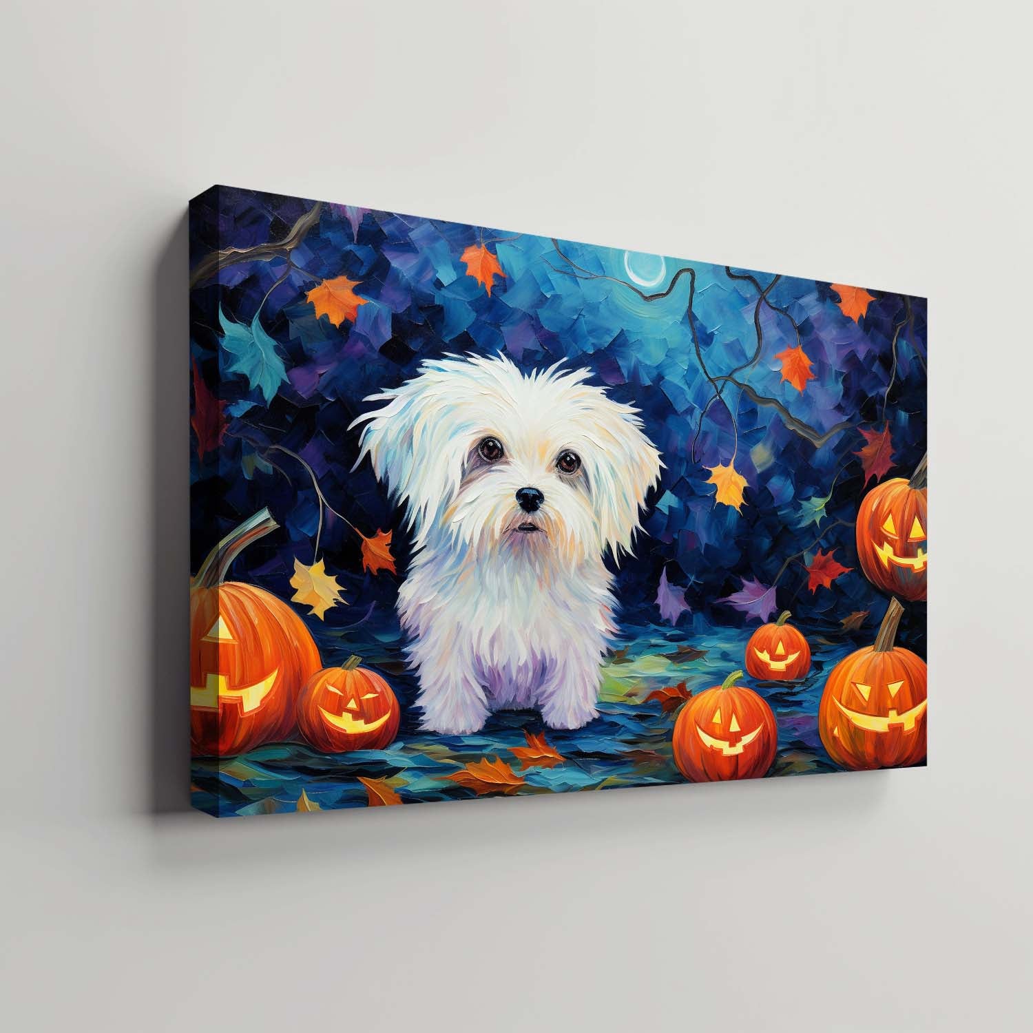 Maltese Dog 03 Halloween With Pumpkin Oil Painting Van Goh Style, Wooden Canvas Prints Wall Art Painting , Canvas 3d Art