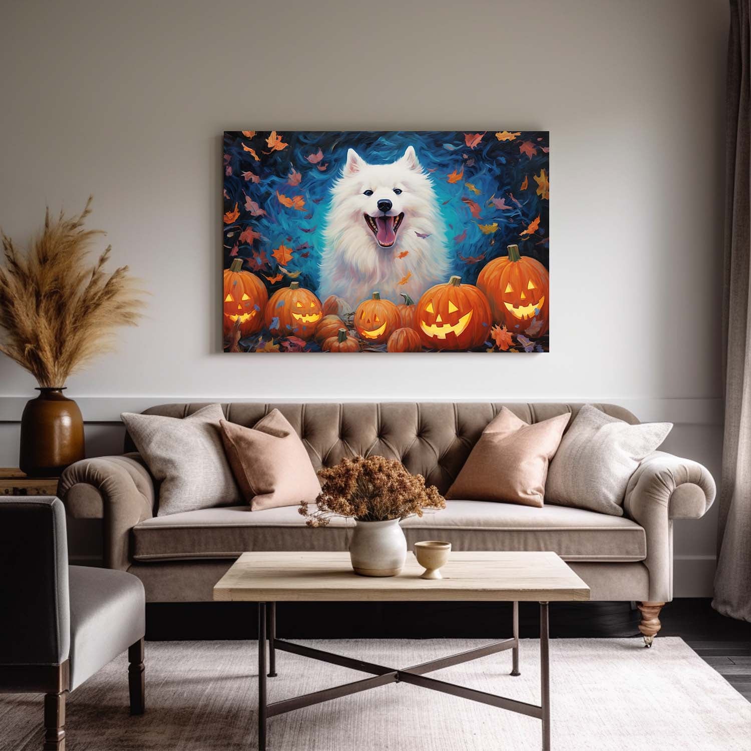 Samoyeds Dog 02 Halloween With Pumpkin Oil Painting Van Goh Style, Wooden Canvas Prints Wall Art Painting , Canvas 3d Art