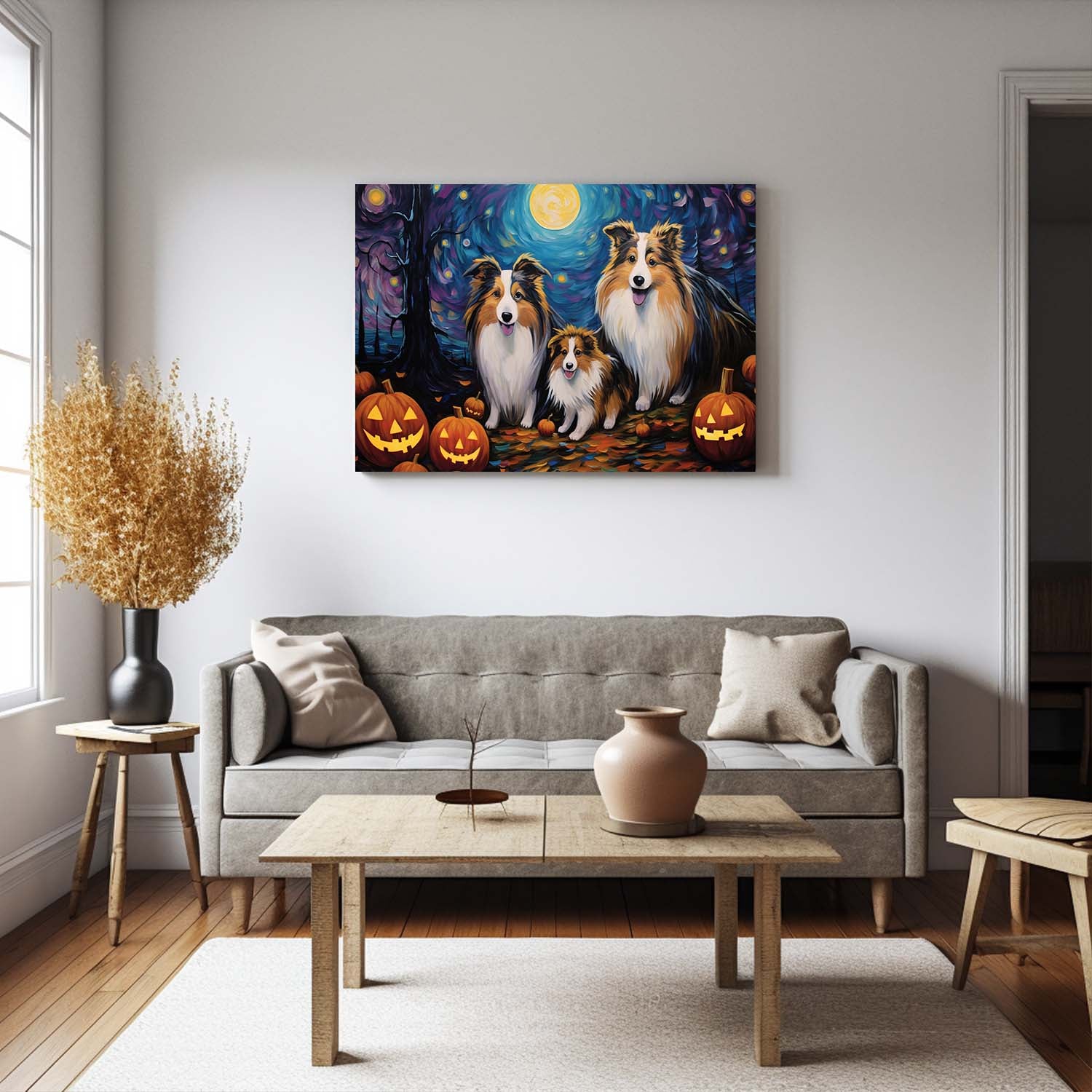 Shetland Sheepdogs Dog 01 Halloween With Pumpkin Oil Painting Van Goh Style, Wooden Canvas Prints Wall Art Painting , Canvas 3d Art