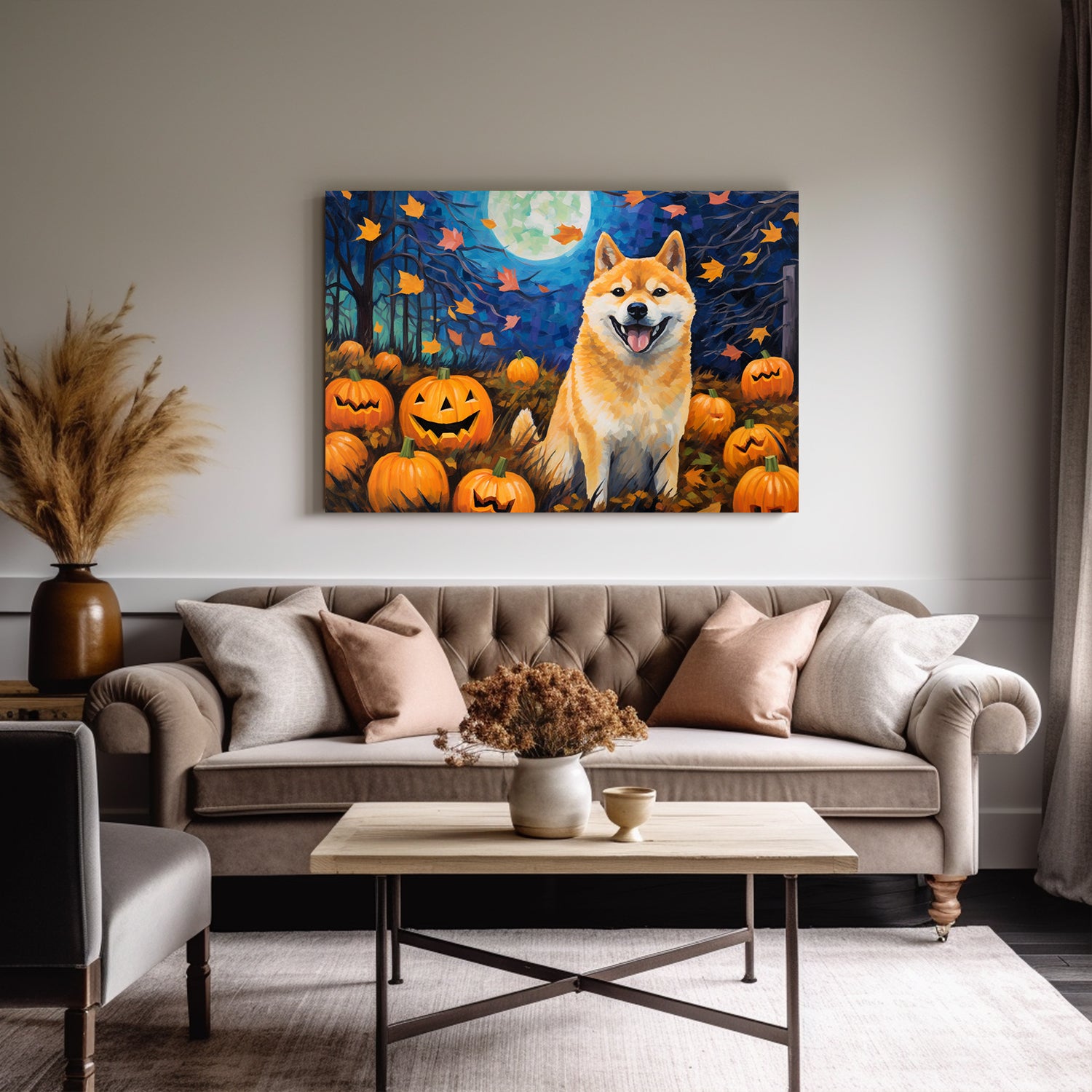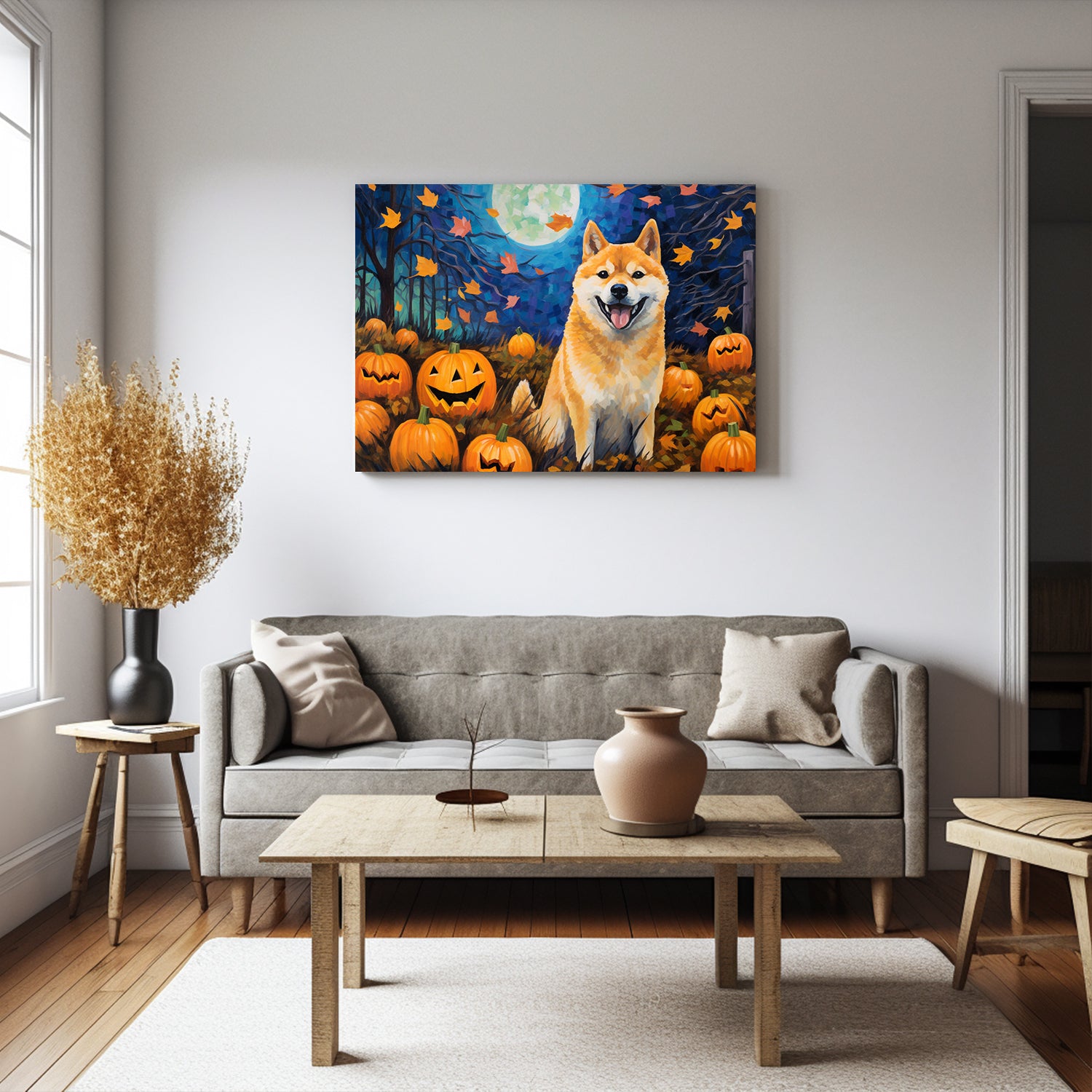 Shiba Inu Dog Halloween With Pumpkin Oil Painting Van Goh Style, Wooden Canvas Prints Wall Art Painting , Canvas 3d Art